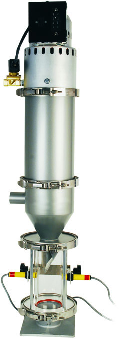 Powder Loaders operate on the same principle as standard loaders but they are designed specifically for conveying dusty regrind and powders like PVC that include blended amounts of titanium dioxide, calcium carbonate, etc. (They are not approved for conveying these additives alone.) Specially designed filters (one to three each) and powerful blowback are required to keep filters from clogging. The conventional dump throat is typical.