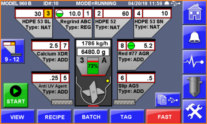 Because each dose of material is weighed as a part of normal operation, the blender automatically provides its own form of “catch and weigh” as a normal part of each blending cycle. As a result, the user can directly input specific weight or ratio percentage settings into the control with no translation into time settings. Operation, although complex inside the control, is actually significantly simpler for the user.