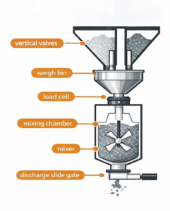 Batch gravimetric blenders use a “gain-in-weight” approach where materials are metered one at a time into a common weighed chamber equipped with load cells. This is fundamentally different from continuous “loss-in-weight” systems that require a separate set of load cells for each ingredient bin.